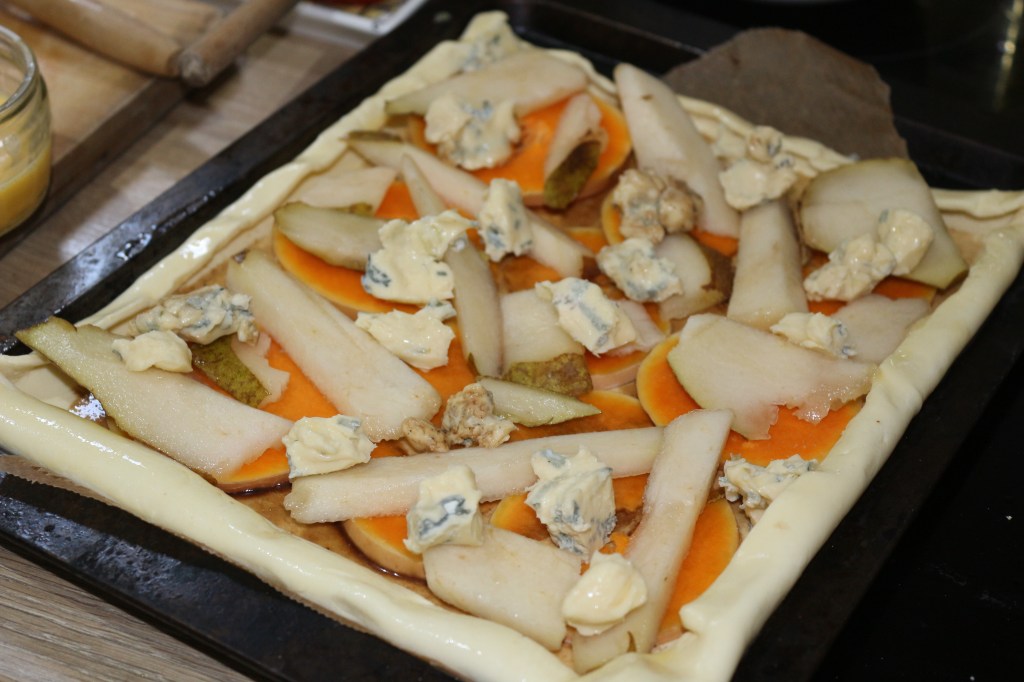 - Layer over the squash, pear and chunks of blue cheese, then brush the edges with egg wash before placing back in the oven to bake until golden and cooked throughout. You will need to monitor the base as this will cook slower than the edges which will brown quickly, so turn the heat down if need be.