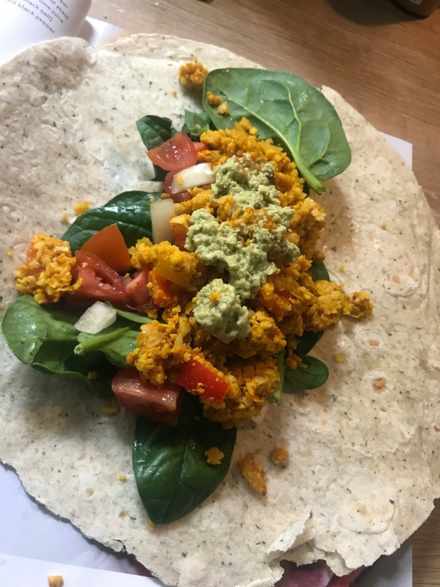 Moving onto eggs, these are something that you may be struggling to work out how you’re going to live without if you’re considering going vegan. There are various replacement options, depending on the type of egg you’re after. To be honest, I don’t have anything to offer when it comes to fried or poached eggs, however, scrambled are a popular vegan choice. Common replacements include, tofu, mashed chickpeas and ackee (a fruit popular in the Caribbean). I have tried the ackee concept, but am yet to have cooked it successfully so can’t speak on behalf of that one. Tofu scramble can be very nice, providing it’s well-spiced and seasoned. One of my favourites, though, was another of Rachel Ama’s recipes for a chickpea scramble breakfast wrap. I’m not sure the scramble would be as satisfying on it’s own, but certainly as a filling it tasted fantastic, and the texture wasn’t bad.