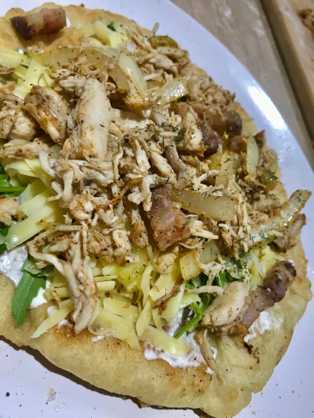 Having said that, when I attempted my own version at home, I have to admit that it was even better than the one I tried in Budapest. After frying, along with the standard sour cream and cheese base, I topped the dough with shredded chicken, pancetta, rocket and onion. Whilst the onion on my Lángos in Budapest was raw, I decided to cook it this time, just to avoid the pungency that raw onion can have. The seasoned toppings were really tasty, and the addition of mashed potato to the dough made it super soft, whilst still maintaining the slightly crispy exterior.