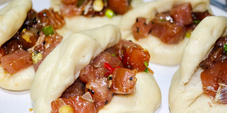 Generally baozi are a filled ‘bun’, with the dough gathered together on top, sometimes leaving a small hole for steam to escape, and complete with either a meat or vegetable filling. One of the most popular is the Char Siu Bao, filled with sticky barbecued pork. Other variants include the xiaolongbao, with xiaolong referring to the bamboo steaming basket in which they are cooked and served., This bao is filled with a hot soup, and is sometimes referred to as a dumpling. The final type of bao that I’ll touch on is the gua bao, which comprises of a flat, open steamed lotus-leaf bun, with a meat (often pork belly) filling.