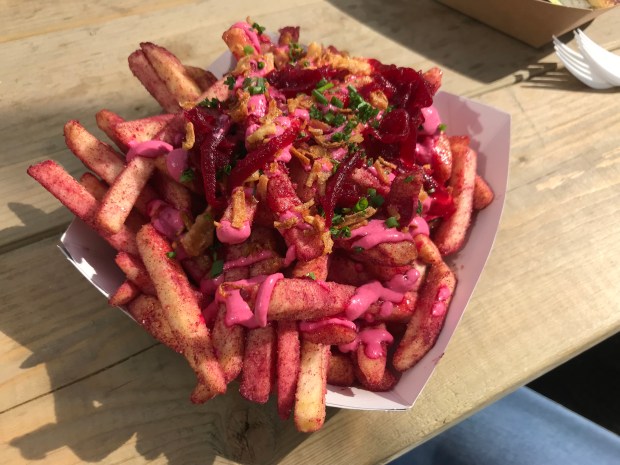 The first were the beetroot fries from Seasoned, at Hatch in Manchester. Slightly less heavy on the toppings, these were incredibly striking what with the beetroot salt and creamy, beetrooty feta sauce. The flavour absolutely lived up to the appearance.