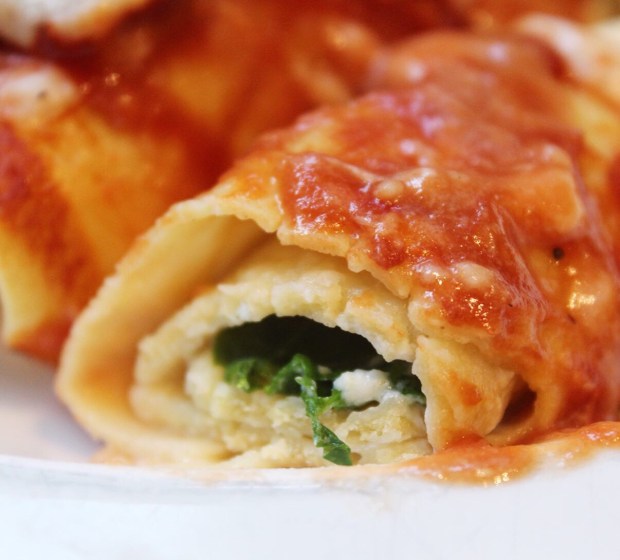 My second pasta attempt (also Gino) was his spinach and ricotta cannelloni, so a slightly different venture to the parcels. In one sense this is even more straightforward, as the pasta sheets don’t need to be cut into shapes, just rolled up, but I’m still unsure as to how the rolling up and sealing of the cannelloni works, and so, although it didn’t affect the flavour, I ended up with about 38585 excess rolls on each pasta tube. Still delicious though with a simple passata tomato sauce.