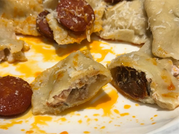 I first tried Gino’s Ham and Ricotta Stuffed Pasta with Chorizo. It’s surprising how easy the pasta sheets are to make – literally just flour and egg, mixed together into your dough and then fed into the machine, ready to be flattened into usable sheets.