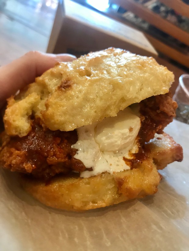 ‘Biscuits’ in the American sense were never something I’d really understood. They looked to me like an unappetising savoury scone that was often covered in a weird thing they attempted to call gravy, but not this one. This biscuit had been French-toastified so it was soft and fluffy, and slightly sweet with a honey glaze, lump of fried chicken in the middle, and hot sauce and mayo. With a modern, verging on hipster feel inside, this was a great first place to dine.
