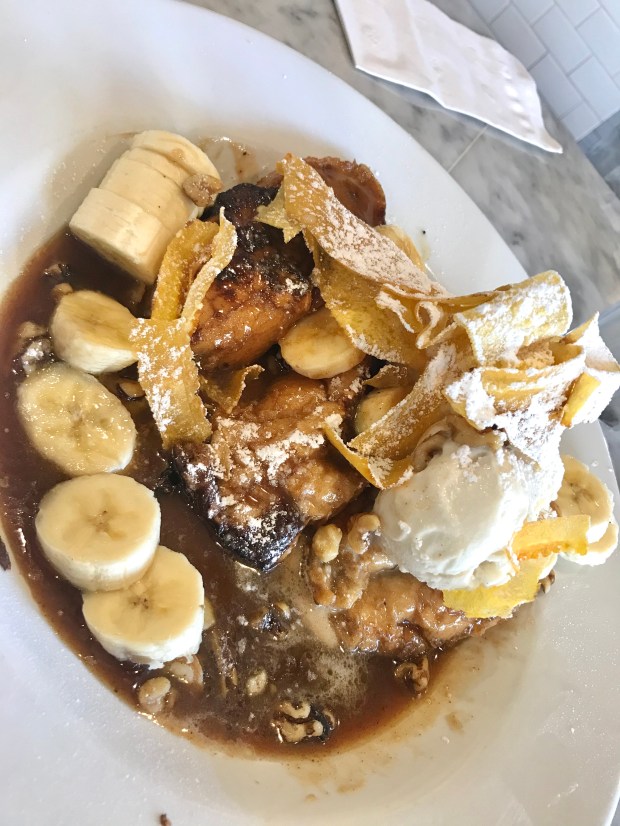 Another evening spent at my air b ‘n’ b, super tired, prepared me for one more day of food and exploration before heading to the airport late that final afternoon. One of my favourite meals, another sweet one, was at Stanley’s, in the beautiful Jackson square, in the heart of the French Quarter. Stanley’s had been recommended frequently as a fantastic all-day brunch place, with their Beaux Bridge Benedict and Bananas Foster French Toast both highly praised. Up to this point, I hadn’t tried anything Bananas Foster-related so this seemed like my last chance. Foster sauce is a delicious syrupy, brown butter and rum sauce, and my French toast came absolutely swimming in it. Not one to miss an opportunity to throw ice cream on everything, the Americans did it again, serving this brunch dish with two giant scoops of vanilla ice cream, walnuts, bananas and banana crisps. I was genuinely shocked by the portion size that arrived, but I couldn’t help but finish it all, even wishing I could drink up the remainder of the Fosters sauce sitting on the bottom of the plate.