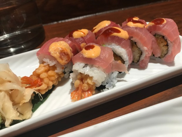 I ordered the Hell’s Kitchen rolls – tempura shrimp with avocado and spicy sauce, topped with tuna and bbq (8 pieces). For anyone who’s concerned about spice levels, although I love a bit of heat and can handle it pretty well, honestly, these were not spicy at all. The puffed rice tempura on the prawns adds a really lovely crunch and the bbq injects some extra flavour.