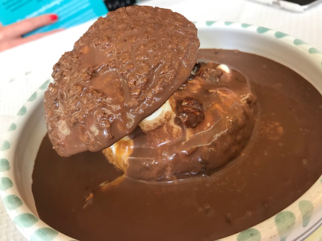Honestly I do not want to keep being negative but this was probably my least favourite course. First off, it really is giant – again, not a dessert for one (and that’s coming from me – someone with an impressive appetite). Sandwiched in between the profiterole pastry is ice cream, but it doesn’t have that lovely vanilla bean flavour you hope for; instead, it’s the kind of bland that you find in those flavourless school choc-ice bars. I had also expected it to be hot, with a rich, warm, fudgey sauce. In reality, the sauce was cold (intentionally so) and pale and seemed more like melted chocolate ice cream. It completely drowns the profiterole which was actually the only bit I semi-enjoyed.