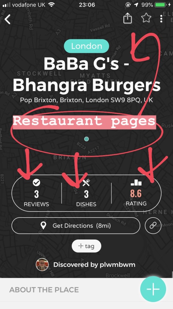 The last part of the app to cover is the restaurants’ personal pages. The vast majority of restaurants etc will have a page even if they don’t yet have reviews. The person to be the first to write a review for that location is said to have ‘discovered’ it as you can see to the right.