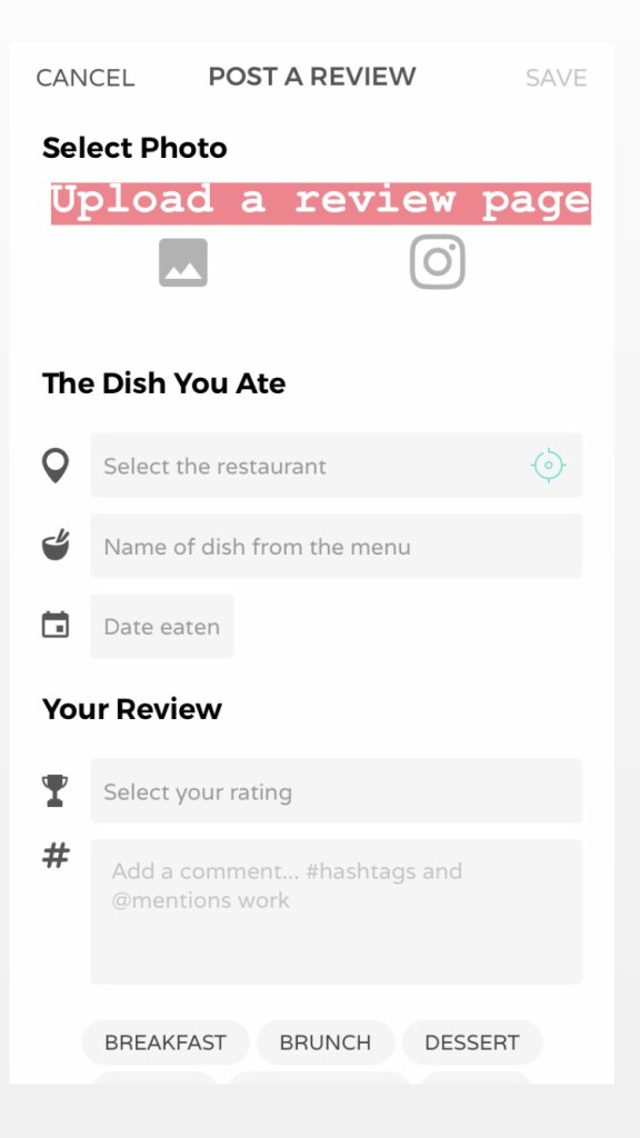 You first select a photo (some people haven’t uploaded a photo but these reviews tend to get ignored). To make life a million times easier for us foodies, there is an option to import your images directly from Instagram, and if you have tagged the location on Instagram already, this will automatically be filled in in the ‘restaurant’ section.
